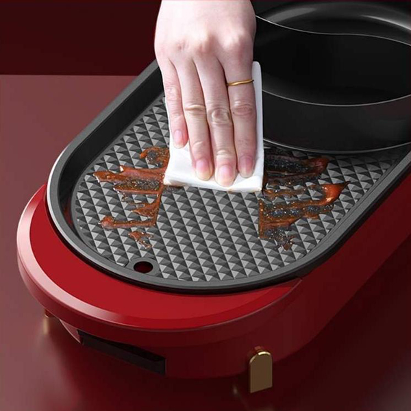 1、轻奢料理生活仪式,只能涮烤盘,双管分区加热双旋扭电子温控,清油少烟易清洁。